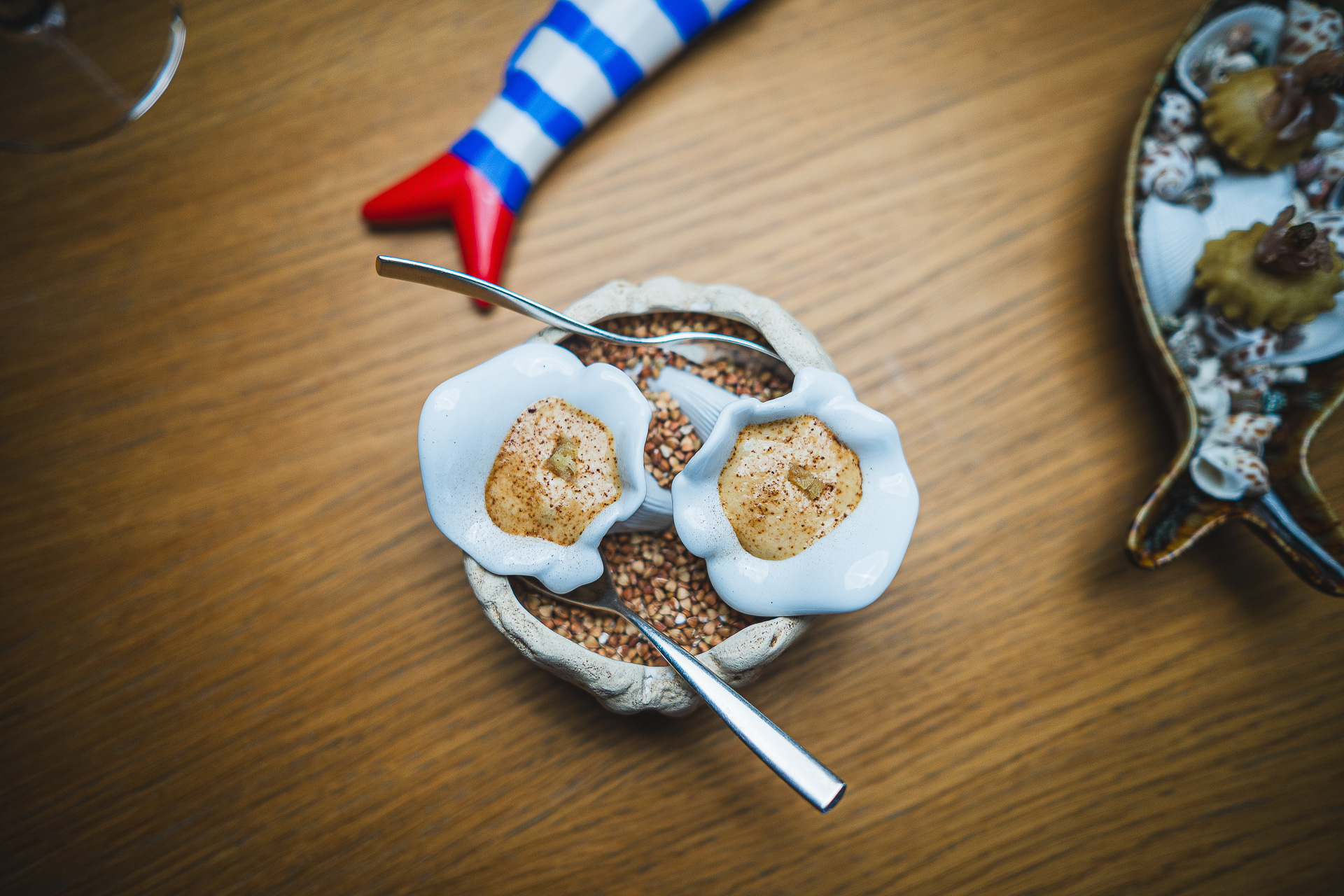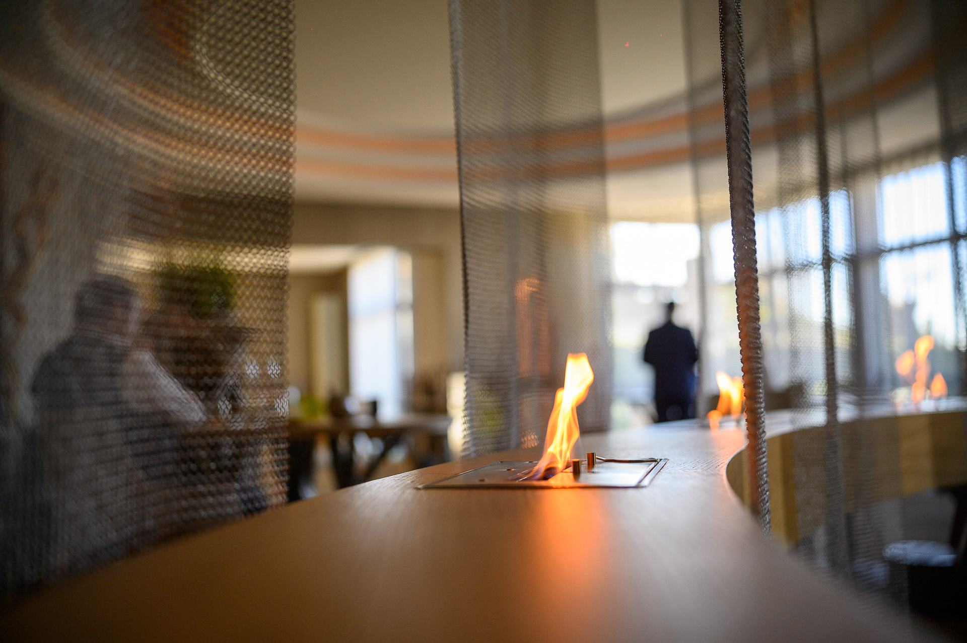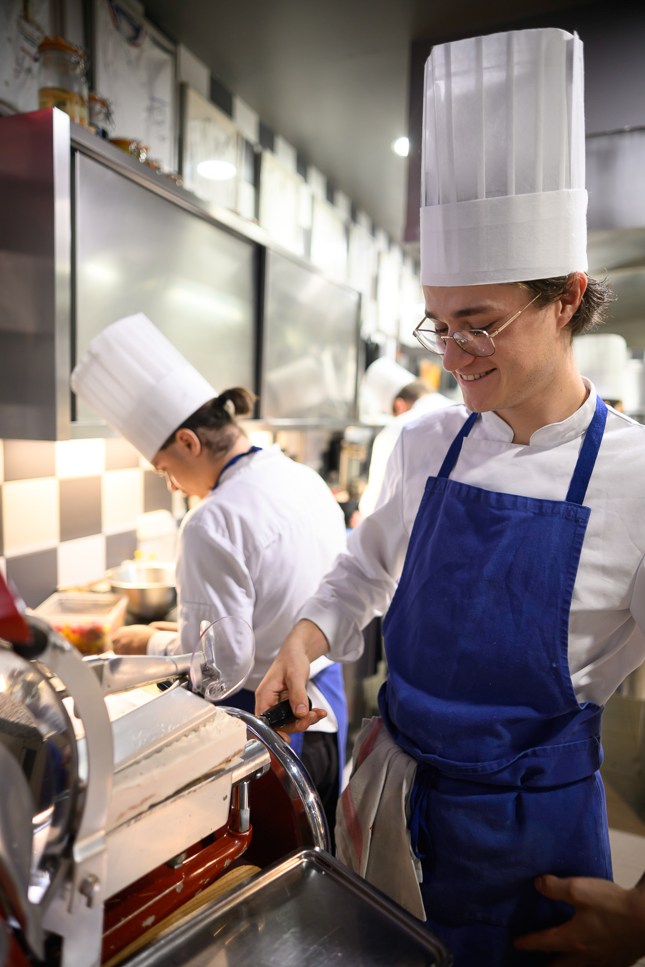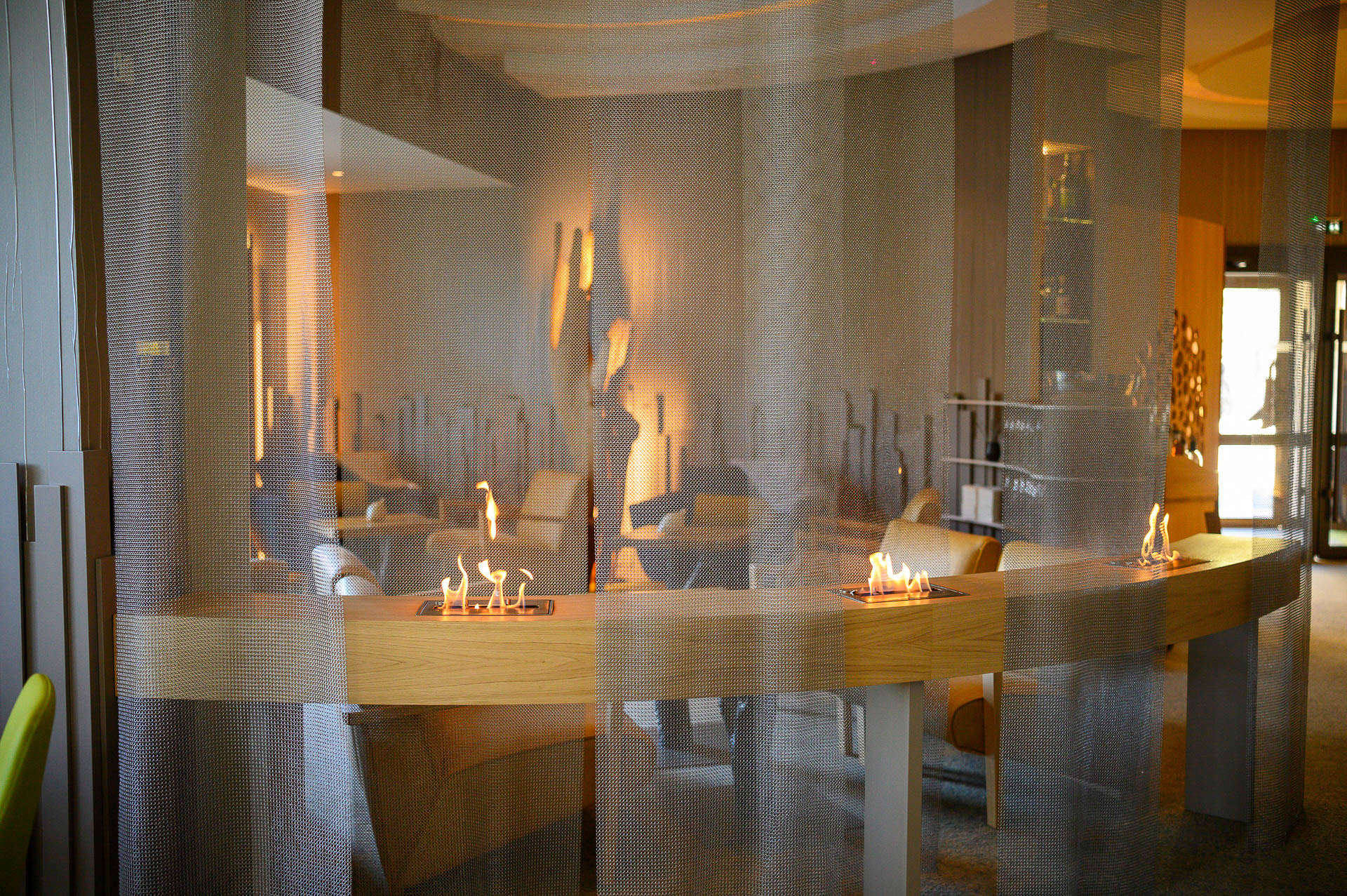 Une ambiance moderne avec aux murs quelques évocations de la cité médiévale, une terrasse ombragée ouverte aux beaux jours et donnant sur le potager, un service efficace et discret.